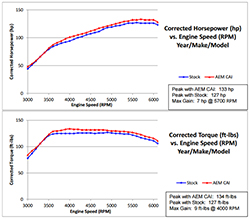 The 2013, 2014, and 2015 Ford Fusion 1.6L EcoBoost turbo engine is a step up from the base naturally aspirated 2.5L Duratec 4-cylinder engine. The optional 1.6L EcoBoost L4 engine adds a little more performance with the real benefits being rated in miles per gallon. Ford EcoBoost technology has managed to squeeze good power and excellent fuel economy out of surprisingly small engines. Similarly, AEM has placed a focus on building air intake systems for small displacement turbocharged engines, whether they run on gasoline or diesel. AEM intake designers were able to free up horsepower and torque for 2013, 2014, & 2015 Ford Fusion 1.6L EcoBoost models by reducing restriction and turbulent airflow with an AEM cold air intake system. The AEM CAI for 2013-2015 Fusion 1.6L EcoBoost models aims to maximize the amount of air available to the 1.6L EcoBoost engine's turbocharger allowing it to spool up quicker. In addition to increasing horsepower, this will also improve drivability during daily driving. AEM Intakes replaced the restrictive factory intake ducting and air filter box with a free-flowing mandrel-bent aluminum air intake tube and an oversized washable AEM Dryflow® performance air filter. By eliminating restrictive factory components, AEM CAI 21-768C was able to provide a dyno proven increase in horsepower and torque. When installed on a stock 2013 Ford Fusion 1.6L EcoBoost Automatic, AEM CAI 21-768C was shown to provide an estimated additional 7 HP and 9 lb-ft of torque.